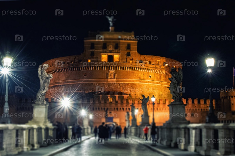 Мавзолей Адриана, обычно известный как Замок Сант-Анджело, и мост Сант-Анджело, освещенный ночью. Фото Рим, Италия
