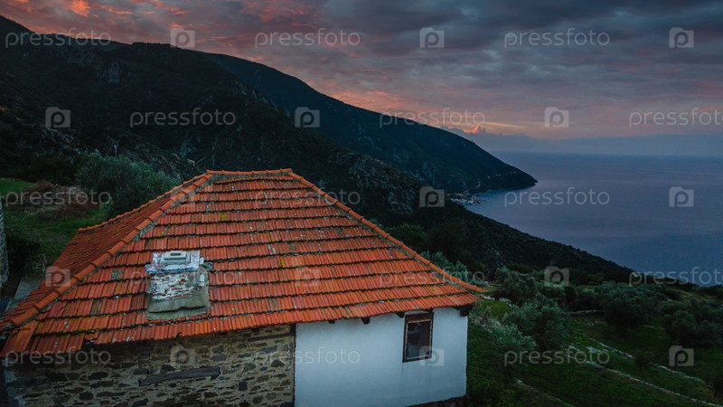 Гора Афон в Греции на закате яркий восход солнца ранним осенним утром