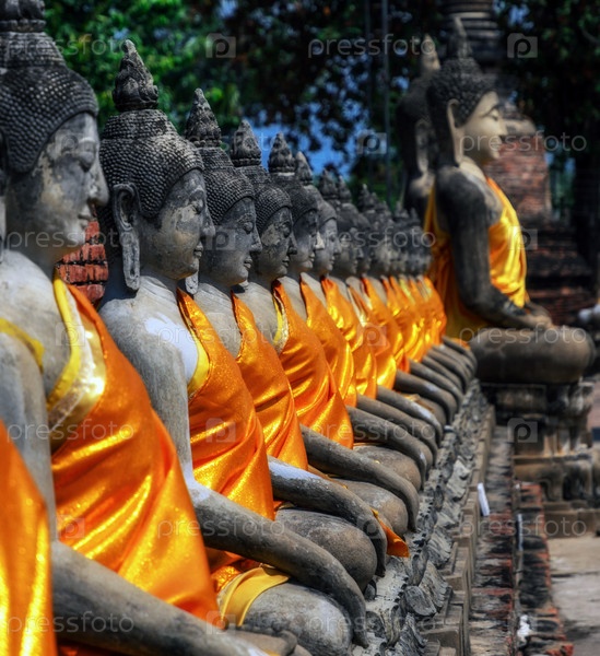 Выровненные статуи Будды в храме Ват Яй Чаймонгкол Аюттхая, Бангкок, Таиланд
