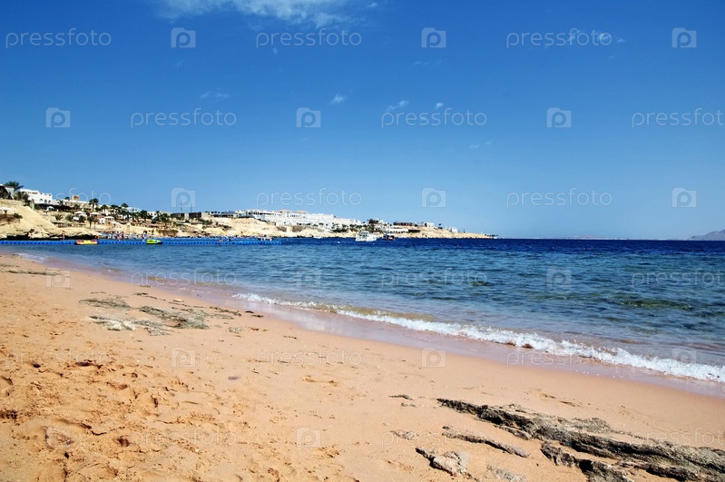 Шезлонг и зонтики на пляже на фоне голубого неба и моря. Египет, Шарм-Эль-Шейх
