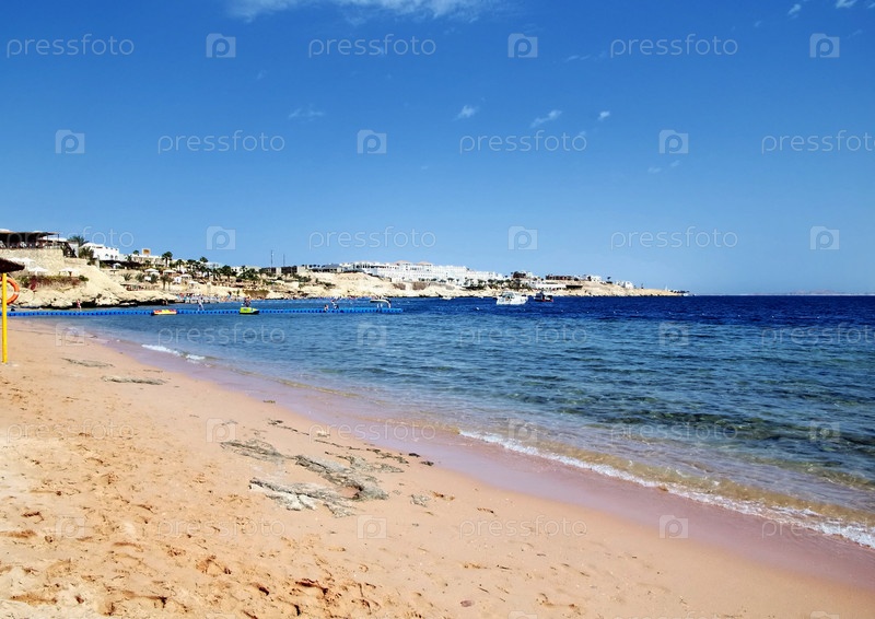 Шезлонг и зонтики на пляже на фоне голубого неба и моря. Египет, Шарм-Эль-Шейх