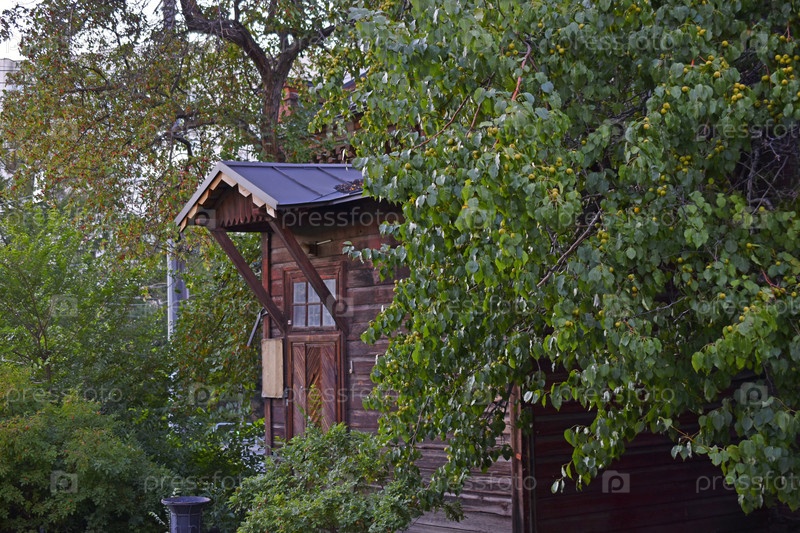 Крыша и крыльцо старого здания в городе летом