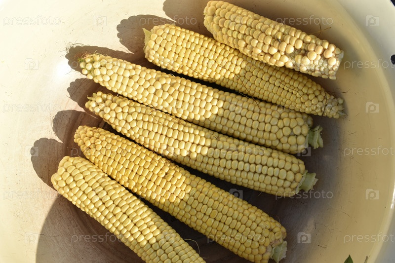 Колосья спелой кукурузы в ведре крупным планом