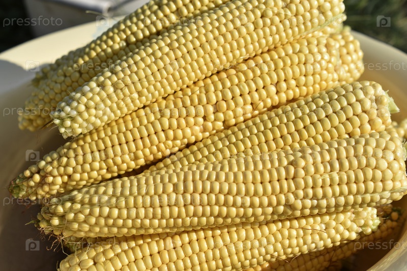 Колосья спелой кукурузы в ведре крупным планом
