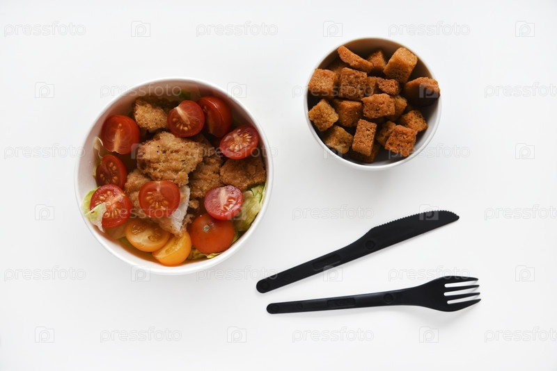 Салат Цезарь с помидорами и панировочными сухарями в контейнерах. Вкусный завтрак с аксессуарами на белом фоне. Салат с мясом и сухарями