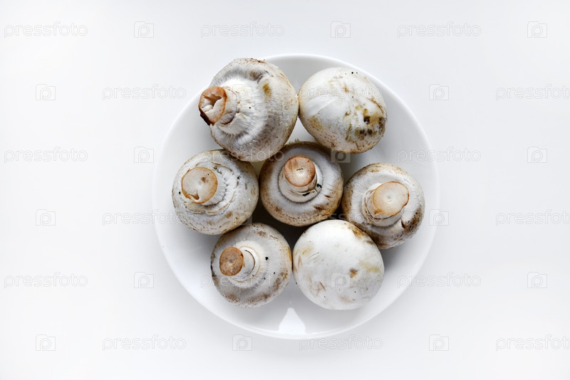 Большие белые грибы в белой тарелке на белом фоне. Грибы на белом фоне. Свежие грибы