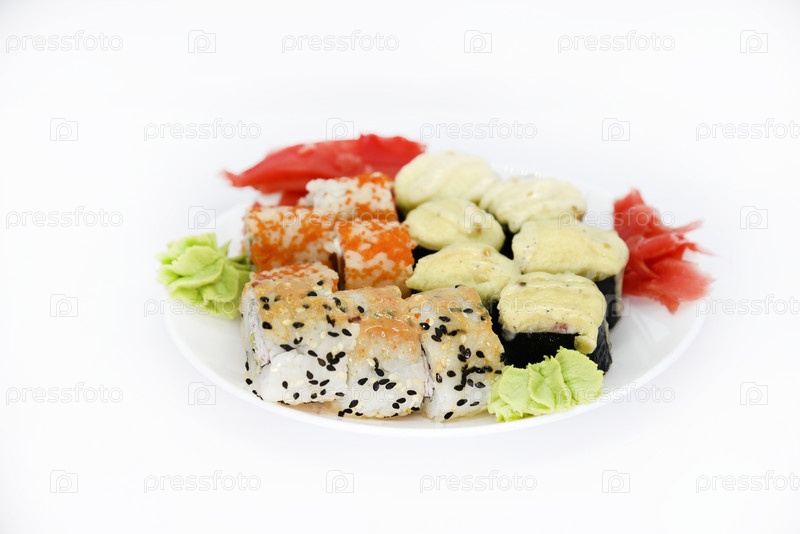 Вкусные запеченные суши и роллы на белой тарелке. Вкусный завтрак из рыбных рисовых рулетов и суши на белом фоне. Восточная рыбная кухня. Японская кухня