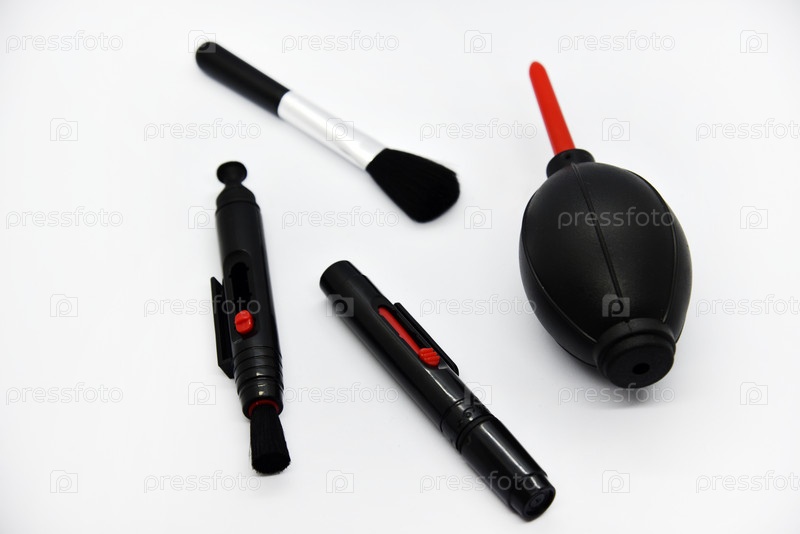 Средства для чистки фотооптики. Пневматическая грушевая кисть на белом фоне. Набор для чистки камеры