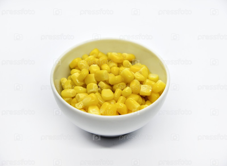 Спелая кукуруза на белой тарелке. Сочная желтая кукуруза. Салат из консервированной кукурузы
