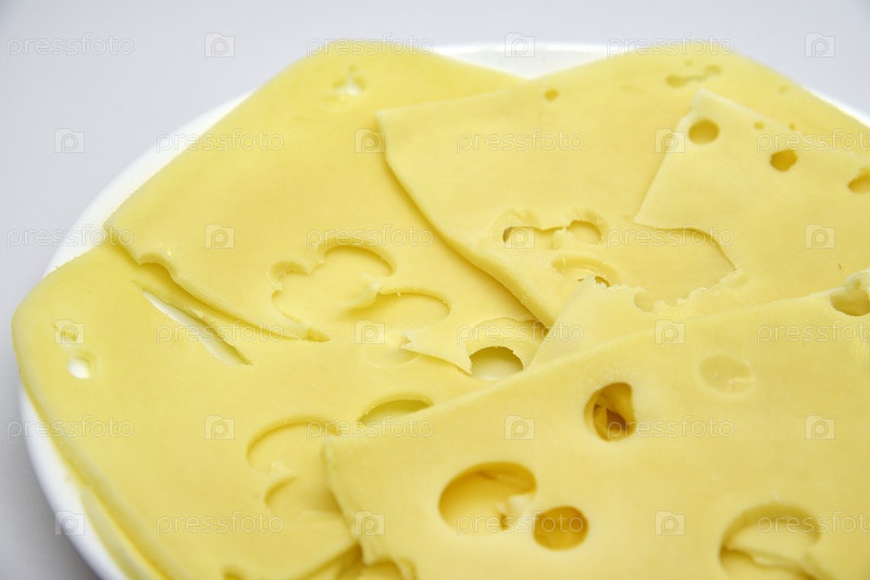 Нарезанные кусочки желтого сыра с отверстиями на тарелке. Нарезанный сыр крупным планом. Вкусные кусочки сыра