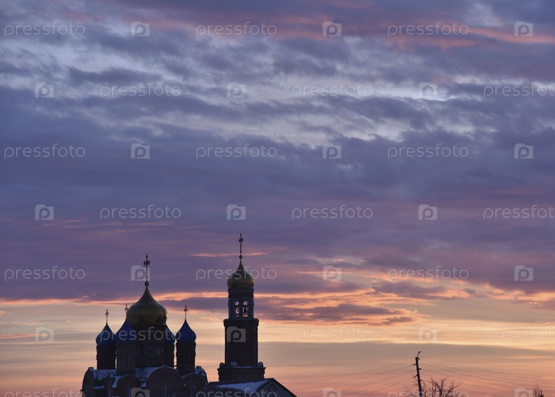 Православная церковь на фоне красивого красного заката. Пейзаж христианской церкви вечером