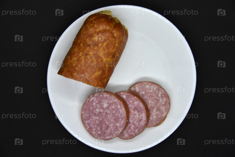 Вкусная мясная колбаса на белой тарелке. Нарезанная ветчина. Кусочки мяса