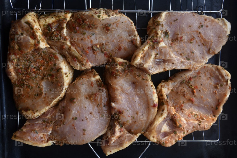 Сырая маринованная свинина. Мясо свинины, приготовленное для барбекю. Сырой кебаб. Приправленное мясо