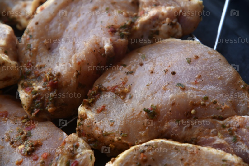 Сырая маринованная свинина. Мясо свинины, приготовленное для барбекю. Сырой кебаб. Приправленное мясо