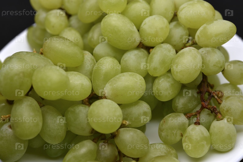 Зеленый виноград на белой тарелке. Грозди зеленого винограда