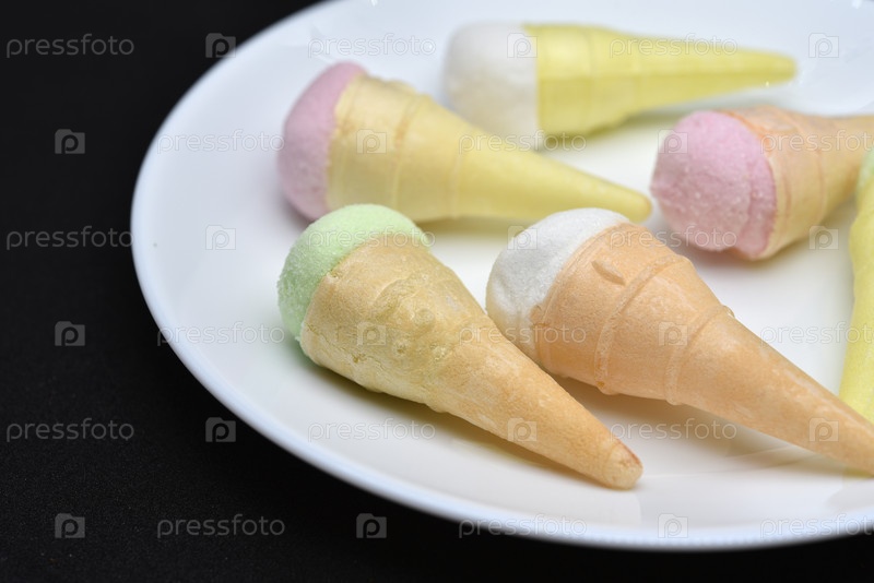 Зефир в виде мороженого на белой тарелке. Красочное мороженое