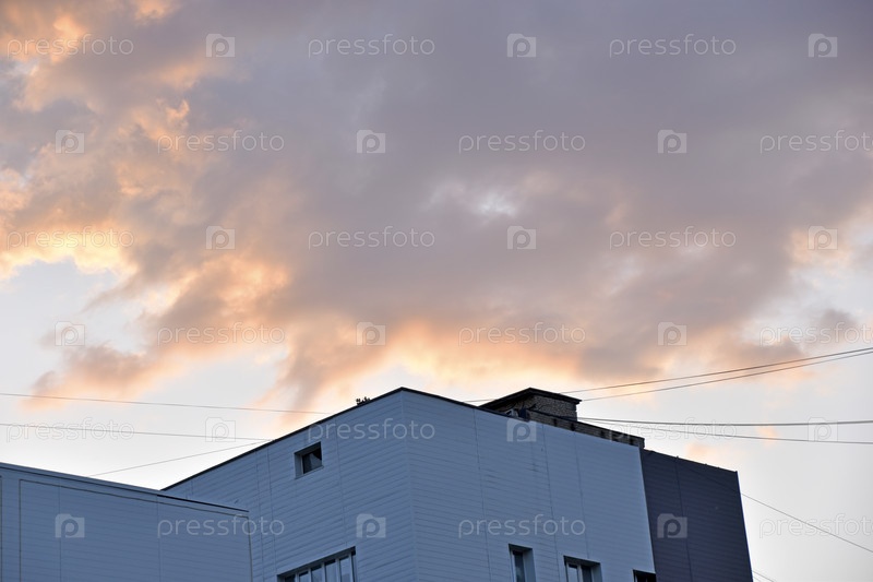 Красочное закатное небо на фоне городских зданий