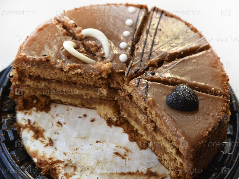 Вкусный медовый торт крупным планом. Нарезанный сладкий торт на белом фоне. Кусочки медовика к празднику