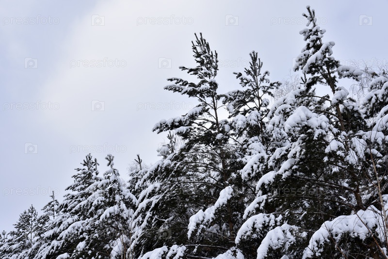 Зимний лес в белом снегу. В лесу на сосновых ветвях много снега. Красивый зимний лес со снегом и елками