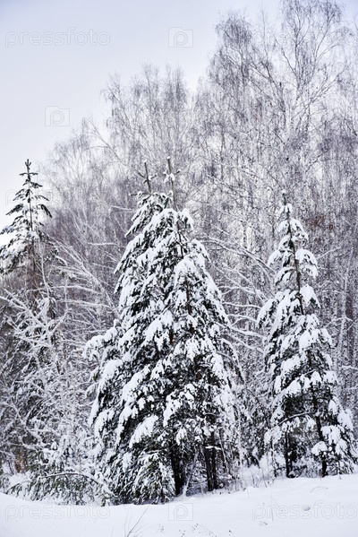 Зимний лес в белом снегу. В лесу на сосновых ветвях много снега. Красивый зимний лес со снегом и елками