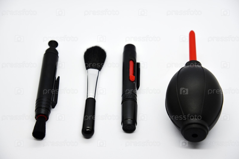 Средства для чистки фотооптики. Пневматическая грушевая кисть на белом фоне. Набор для чистки камеры