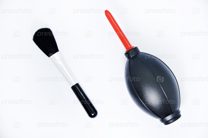 Средства для чистки фотооптики. Пневматическая грушевая кисть на белом фоне. Набор для чистки камеры