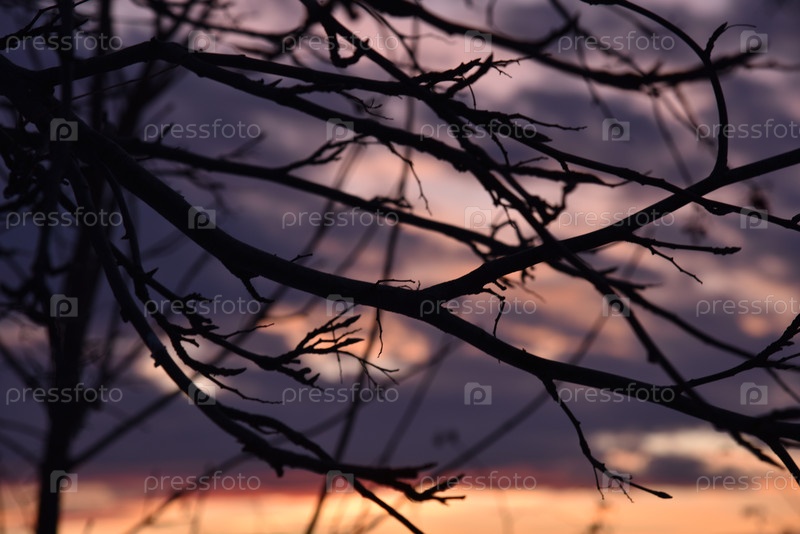 Темные ветки рябины на фоне красно-синего заката. Черные ветки на фоне красивого заката