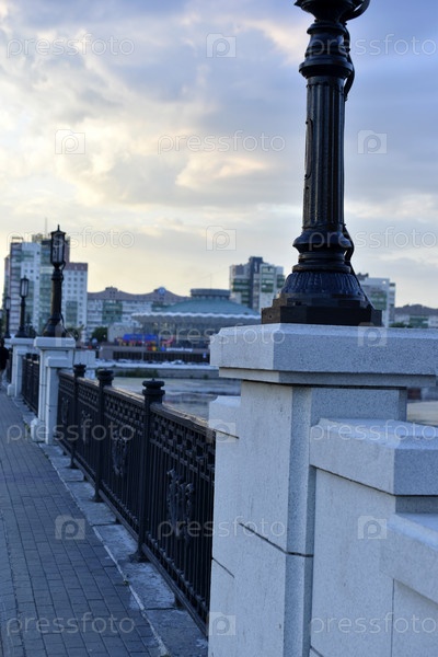 Красивый каменный мост на набережной в прекрасный вечер. Ограждение моста на набережной и прохожие