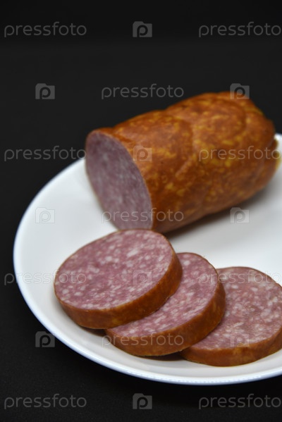 Вкусная мясная колбаса на белой тарелке. Нарезанная ветчина. Кусочки мяса