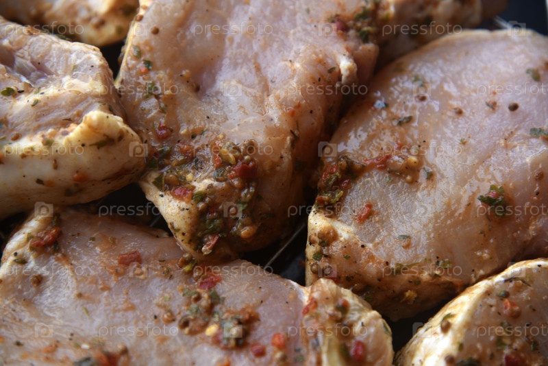 Сырая маринованная свинина. Мясо свинины, приготовленное для барбекю. Сырой кебаб. Приправленное мясо
