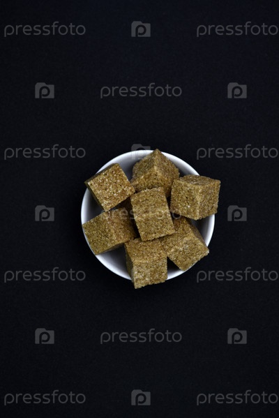 Кусочки тростникового сахара в миске. Рафинированный сахар. Сахар кусками в чашке