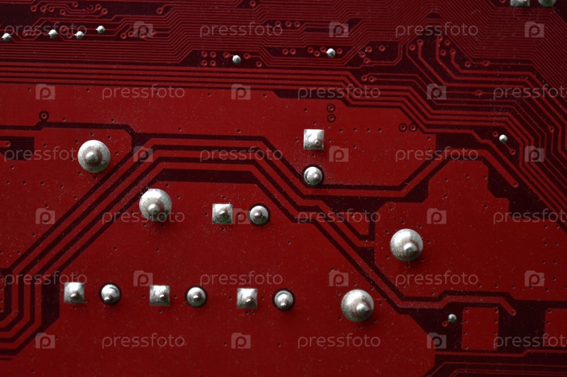 Красный чип материнской платы компьютера крупным планом с элементами