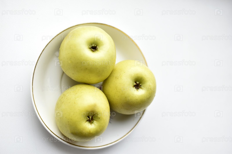 Три зеленых яблока на белой тарелке