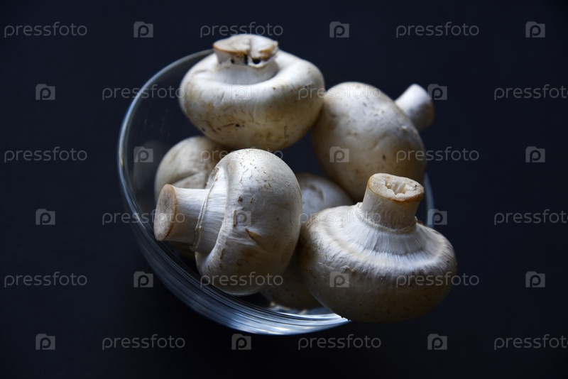 Белые грибы в белой тарелке на черном фоне. Плоды крупных белых шампиньонов крупным планом. Красивые грибы в тарелке