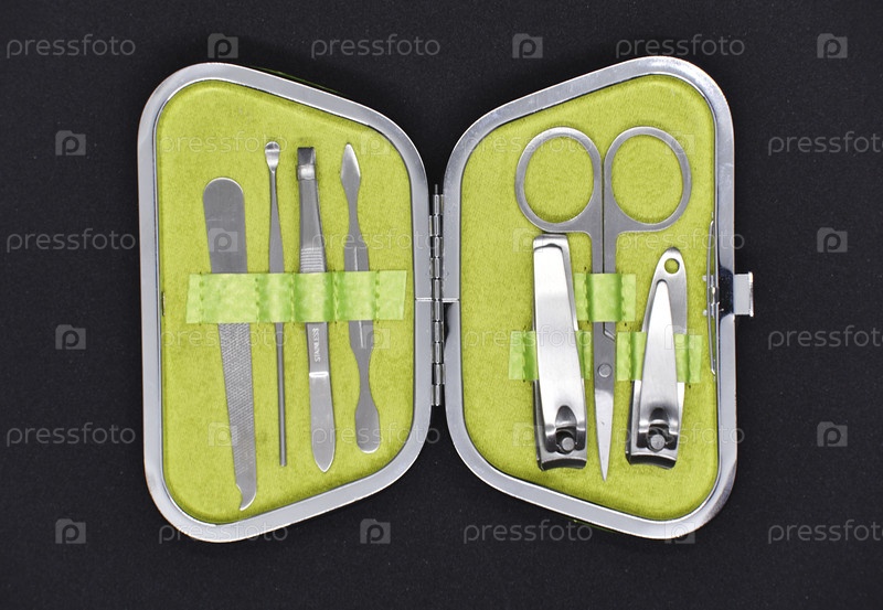 Зеленый маникюр на черном фоне. Ножницы и щипцы для ухода за руками