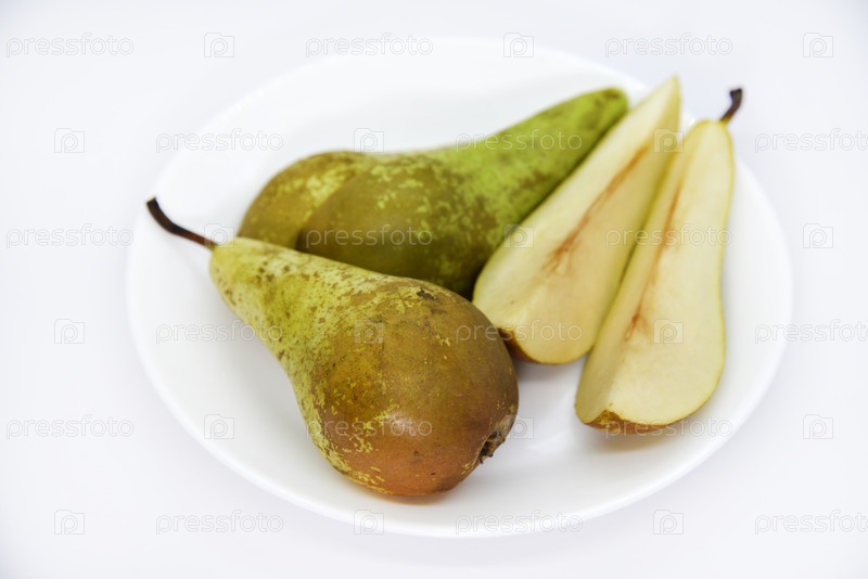 Нарезанные зеленые груши на тарелке. Вкусная груша. Сервированная тарелка с грушей