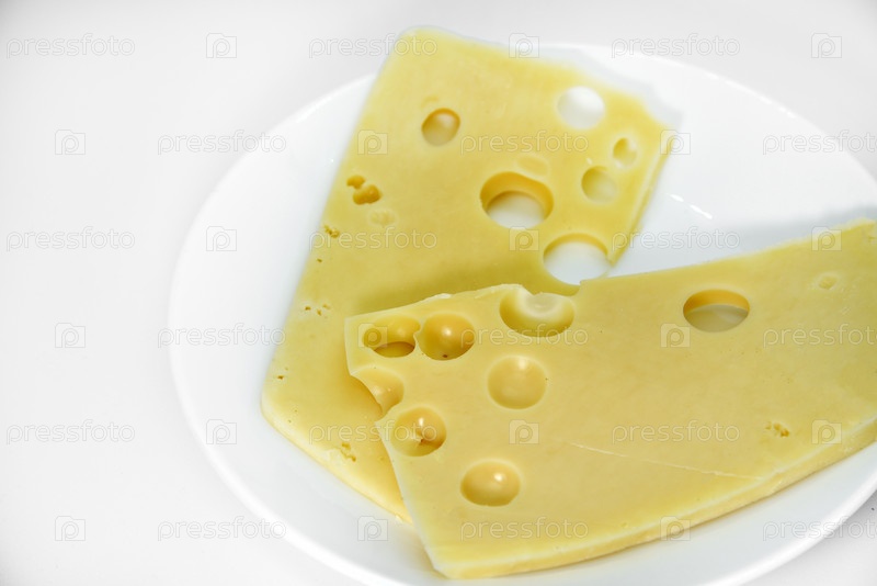 Кусочки сыра с отверстиями на белой тарелке. Ломтики сыра с большими дырками. Вкусный сыр на тарелке