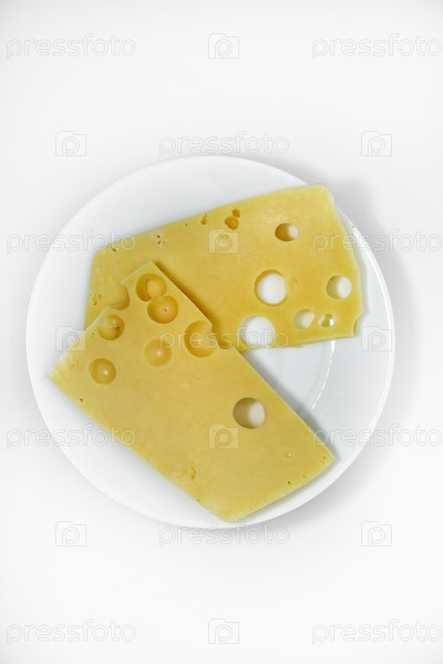 Кусочки сыра с отверстиями на белой тарелке. Ломтики сыра с большими дырками. Вкусный сыр на тарелке