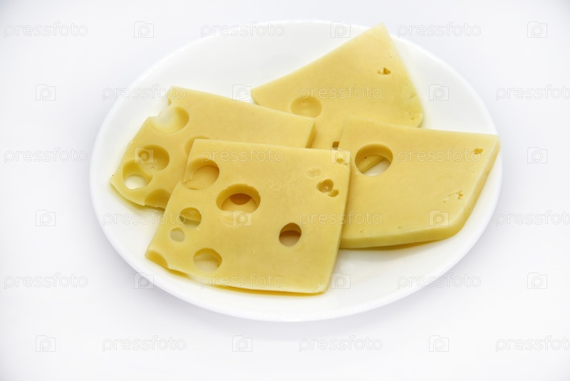 Кусочки сыра с отверстиями на белой тарелке. Ломтики сыра с большими дырками. Вкусный сыр на тарелке