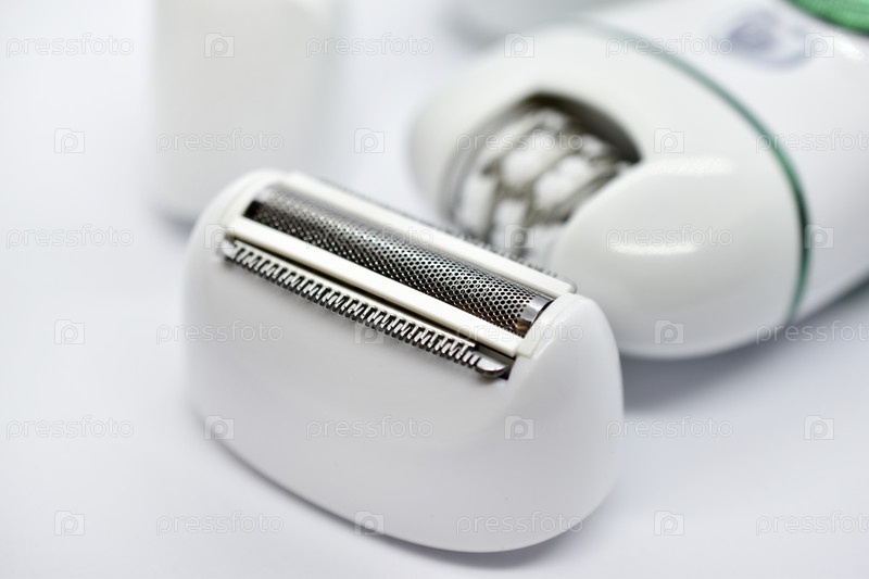 Белая женская электрическая бритва. Электробритвенные головки. Бритвенные головки и электробритва