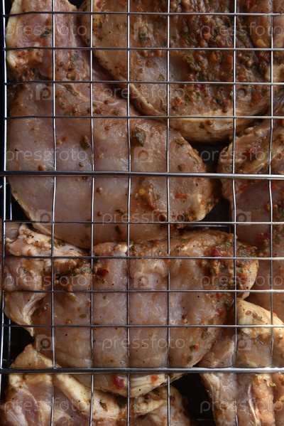 Сырая маринованная свинина в железной сетке. Сетка для барбекю. Вкусная сырая свинина