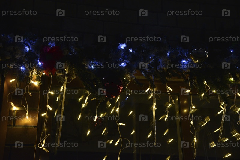 Рождественское освещение и светодиодные лампочки на окне дома ночью