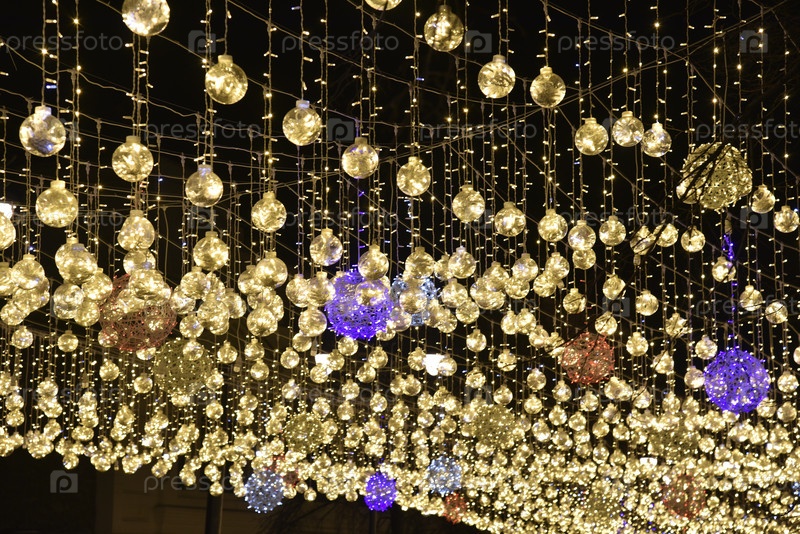 Красивое и яркое светодиодное освещение на улице. Подвесные гирлянды из светодиодных ламп. Большие лампы