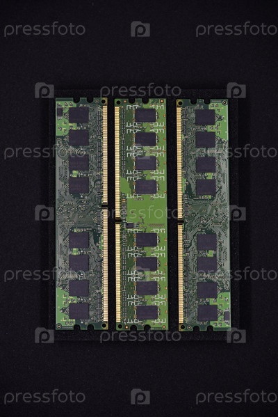 Зеленые полосы оперативной памяти (RAM) на черном пену. Компьютерные чипы в крупном плане. Крипты и микросхемы памяти