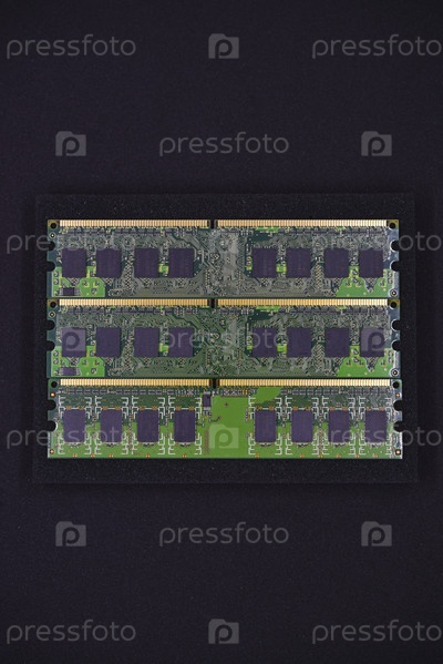 Зеленые полосы оперативной памяти (RAM) на черном пену. Компьютерные чипы в крупном плане. Крипты и микросхемы памяти