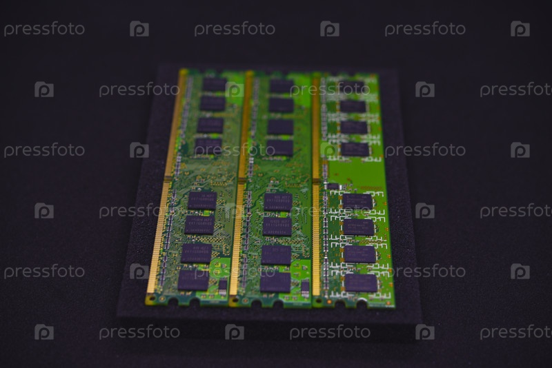 Зеленые полосы оперативной памяти (RAM) на черном пену. Компьютерные чипы в крупном плане. Крипты и микросхемы памяти