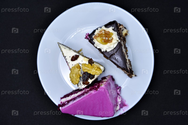 Вкусные сладкие пирожные на тарелке. Нарезанный торт с орехами и сладостями. Сладкий торт