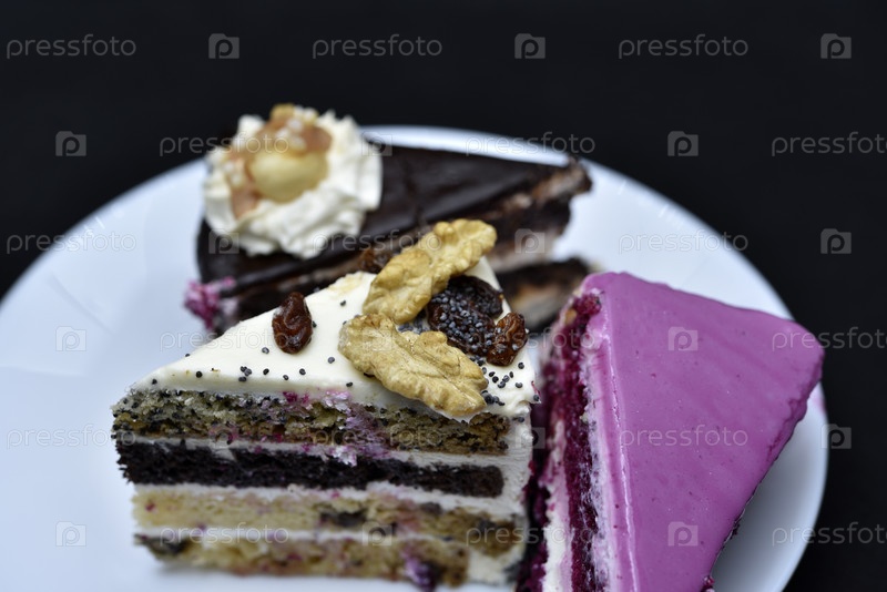 Вкусные сладкие пирожные на тарелке. Нарезанный торт с орехами и сладостями. Сладкий торт