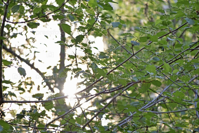 Зеленые ветки деревьев летом на фоне солнца