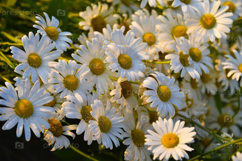 Красивый букет белых ромашек в лучах заходящего солнца. Красивые цветы ромашки вечером